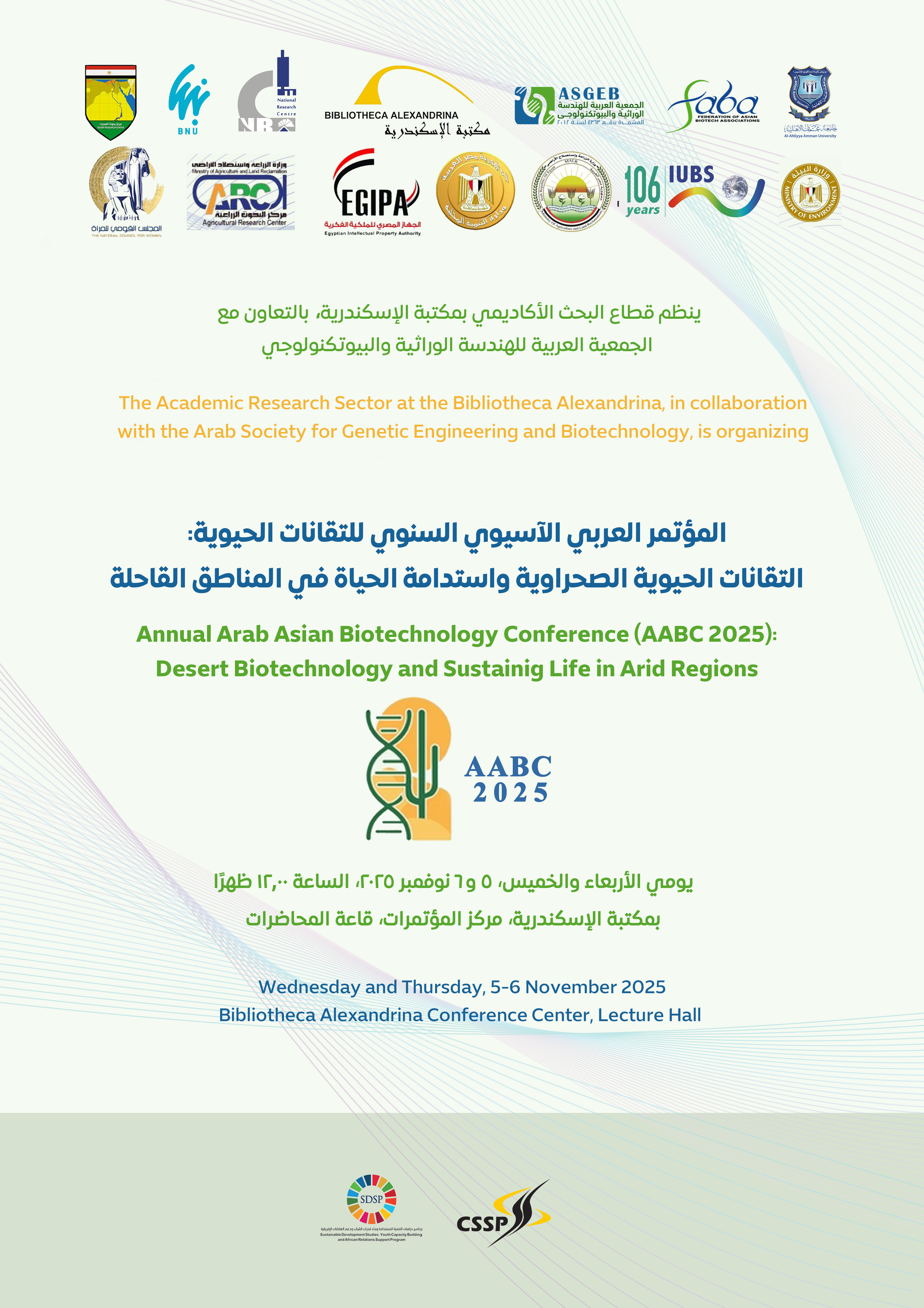 The Bibliotheca Alexandrina, in collaboration with the Arab Society for Genetic Engineering and Biotechnology at the National Research Center, organized the Annual Arab-Asian Biotechnology Conference, which this year came under the theme “Desert Biotechnology and Sustaining Life in Arid Regions.” The conference was held on 5 and 6 November 2025, at 9:00 am, in the Lecture Hall of the Library’s Conference Center.