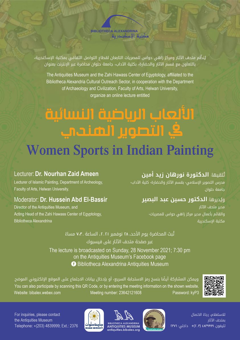 يُنظم متحف الآثار ومركز زاهي حواس للمصريات بمكتبة الإسكندرية، بالتعاون مع قسم الآثار والحضارة بكلية الآداب، جامعة حلوان، محاضرة عبر الإنترنت بعنوان « الألعاب الرياضية النسائية فى التصوير الهندى». تُلقي المحاضرة الدكتورة نورهان زيد أمين، محاضر التصوير الإسلامي بقسم الآثار والحضارة، كلية الآداب، جامعة حلوان. وتُبث المحاضرة يوم الأحد، 28 نوفمبر 2021، الساعة 7.30 مساءً، عبر صفحة متحف الآثار على فيسبوك https://www.facebook.com/Bibliotheca-Alexandrina-Antiquities-Museum-219232808274600