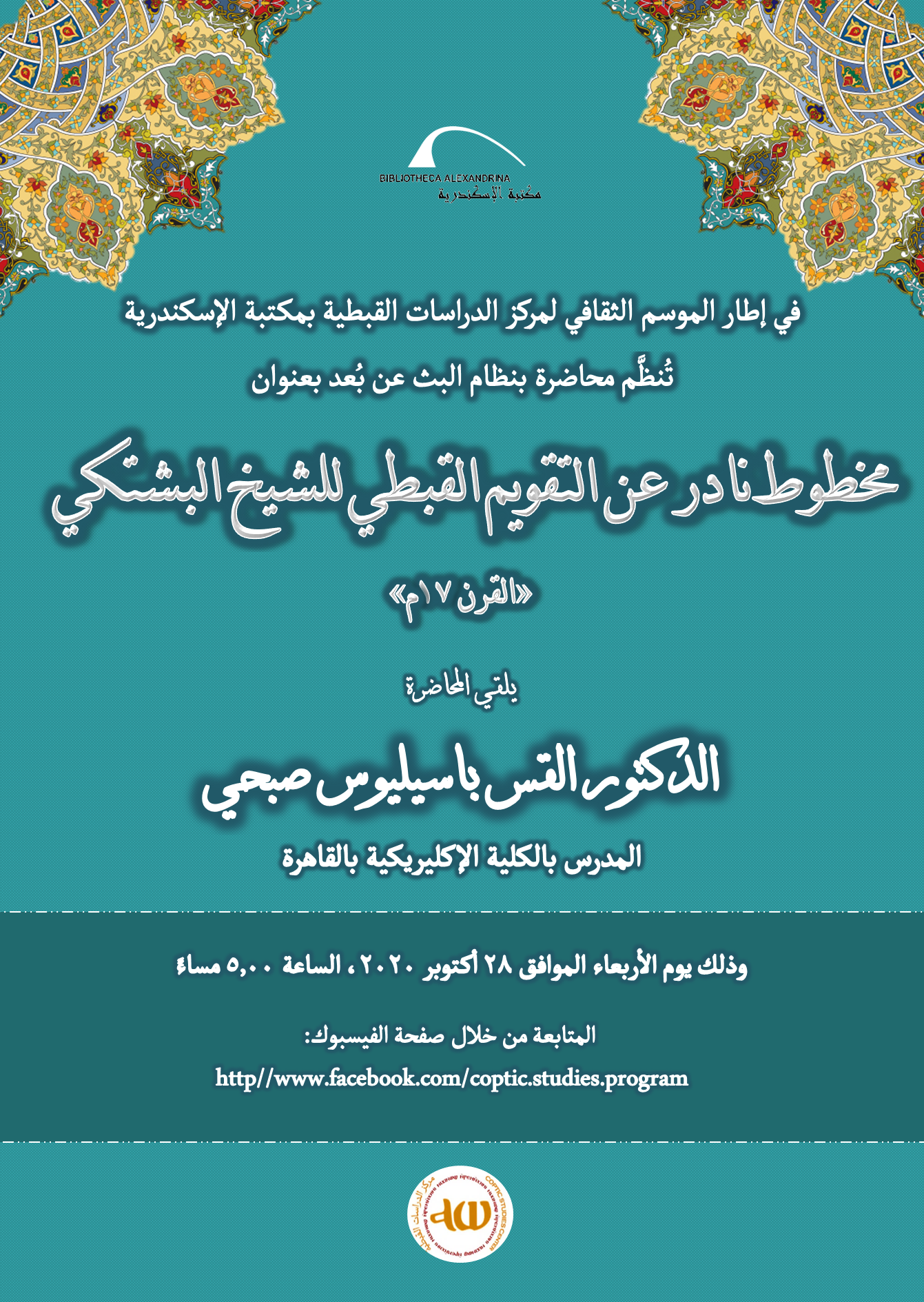 The lecture will be broadcast online on Wednesday, 28 October 2020, at 5:00 pm, through the BA Center for Coptic Studies Facebook page:
