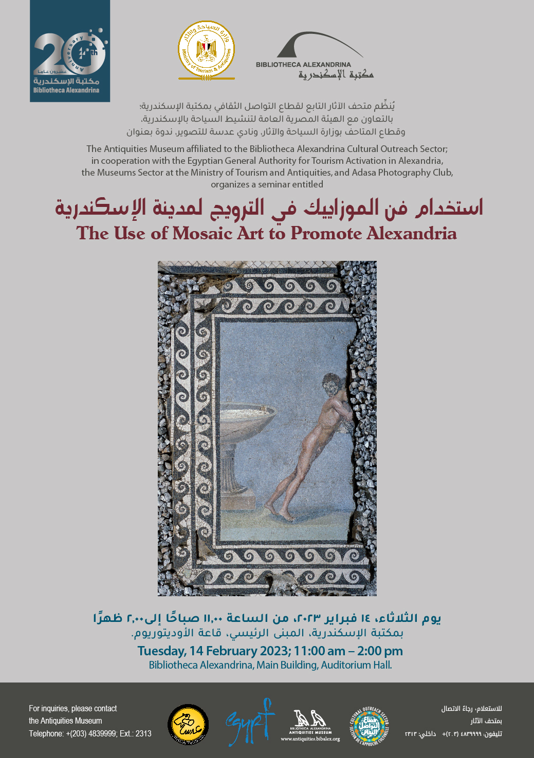 The BA Antiquities Museum – in cooperation with the Egyptian General Authority for Tourism Promotion in Alexandria, the Museums Sector at the Ministry of Tourism and Antiquities, and ADASA Club – organizes a seminar entitled “The Use of Mosaic Art to Promote Alexandria.” It is held on Tuesday, 14 February 2023, at 11:00 am, in the Auditorium Hall, BA Main Building.